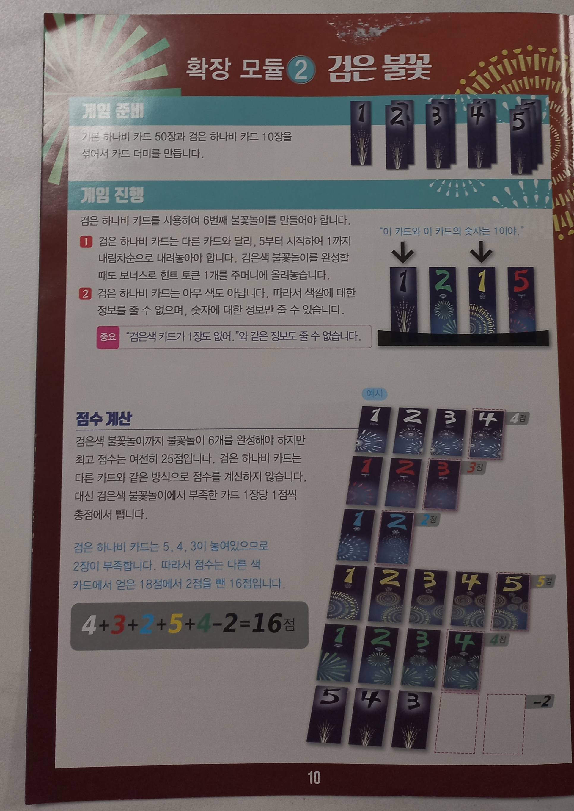 검은불꽃 버전도 하나비 기본 카드 ( 노랑,빨강,흰색,파랑,초록)에다 위의 검은 카드를 포함시켜 플레이합니다.