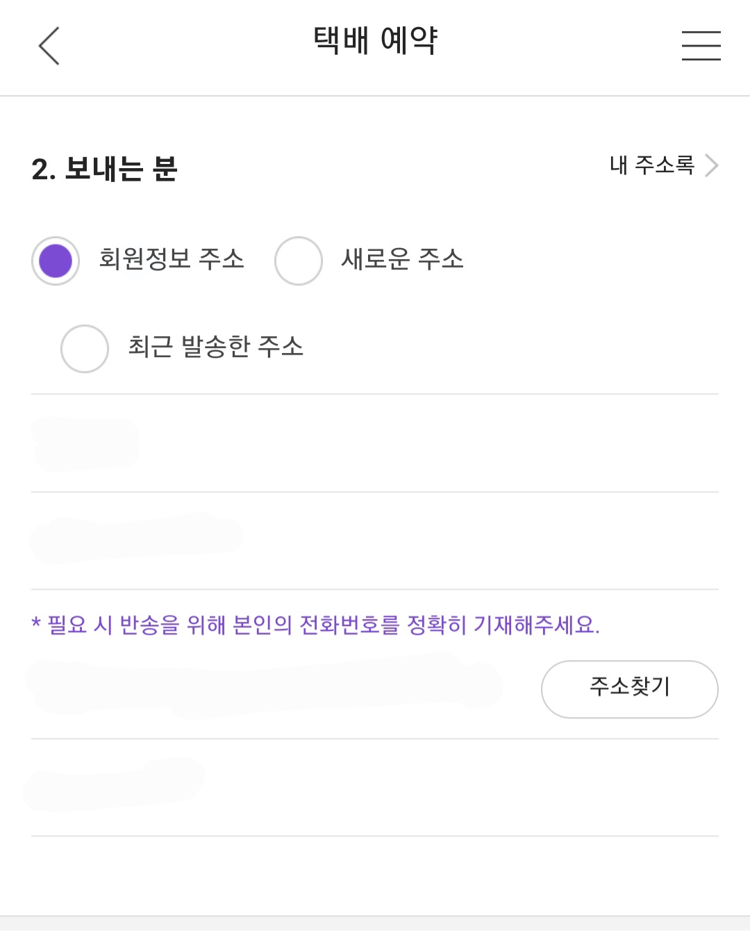 받는 사람 이름, 전화번호, 주소를 입력합니다.